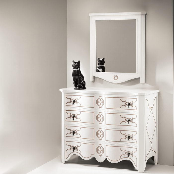 The Louis XV Commode enchants with its beauty and elegance: a four-drawer piece of furniture, meticulously inlaid in cherry and walnut wood, that pays homage to the golden era of Rococo style, the mid-1700s. Its shaping, present on both the front and the top, follows the curvilinear and pronounced line of the apron, making it a masterpiece of artisanal design. The marquetry, enriched by a refined play of two-tone colors, unfolds in delicate and evocative arabesques on the front and top, then transforming into sinuous geometric threading on the sides. In every detail, this furniture piece reflects a love for art and dedication to handcrafting. A true work of art, a tribute to Italian craftsmanship, capable of giving a unique and exclusive style to any home environment.