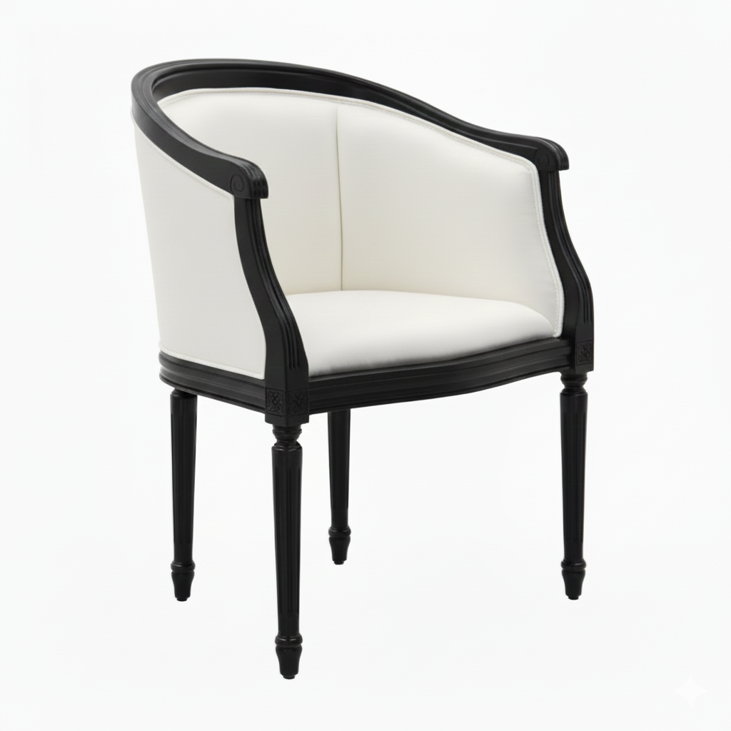 Poltroncina con schienale sagomato che termina nel bracciolo, tappezzata con tessuto o pelle e gambe delicatamente inclinate. Nella foto, legno ebanizzato e tintato (codice: MI01 sfumato nero).